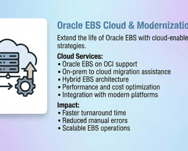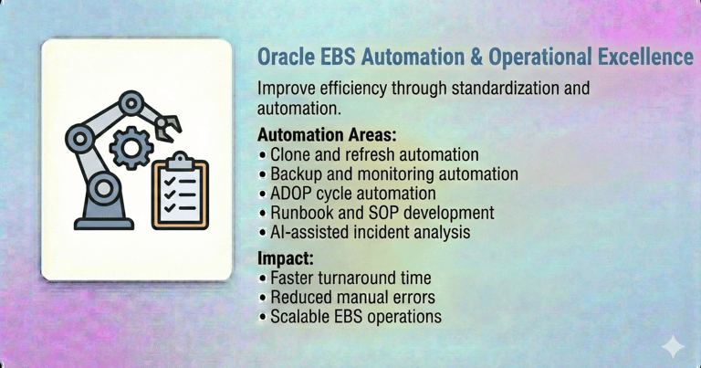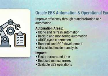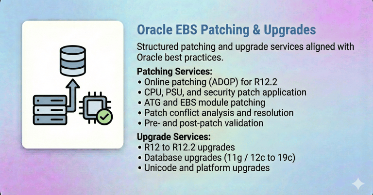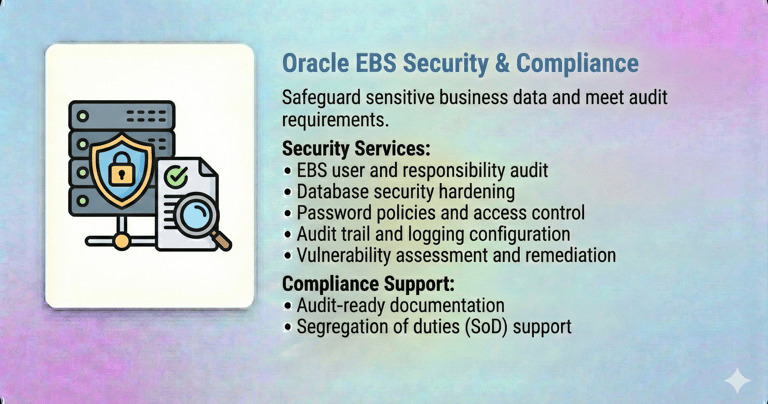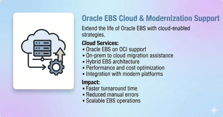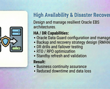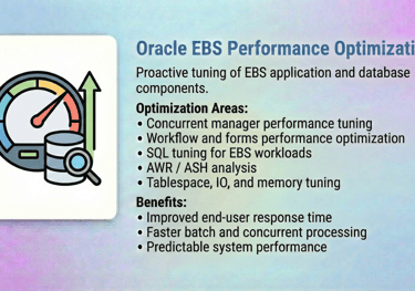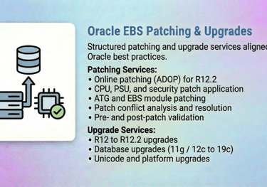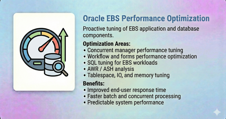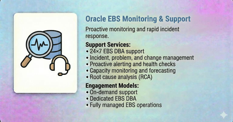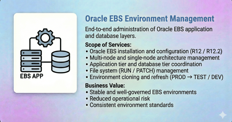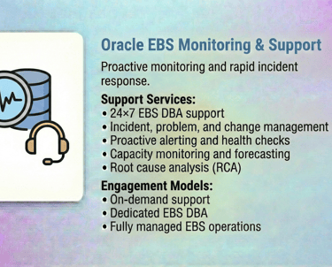 Our Oracle E-Business Suite (EBS) DBA Services are designed to ensure the stability, performance, security, and availability of your mission-critical Oracle EBS environments. With deep expertise across Oracle EBS R12 / R12.2, we help enterprises run, optimize, and modernize their EBS platforms with confidence.
